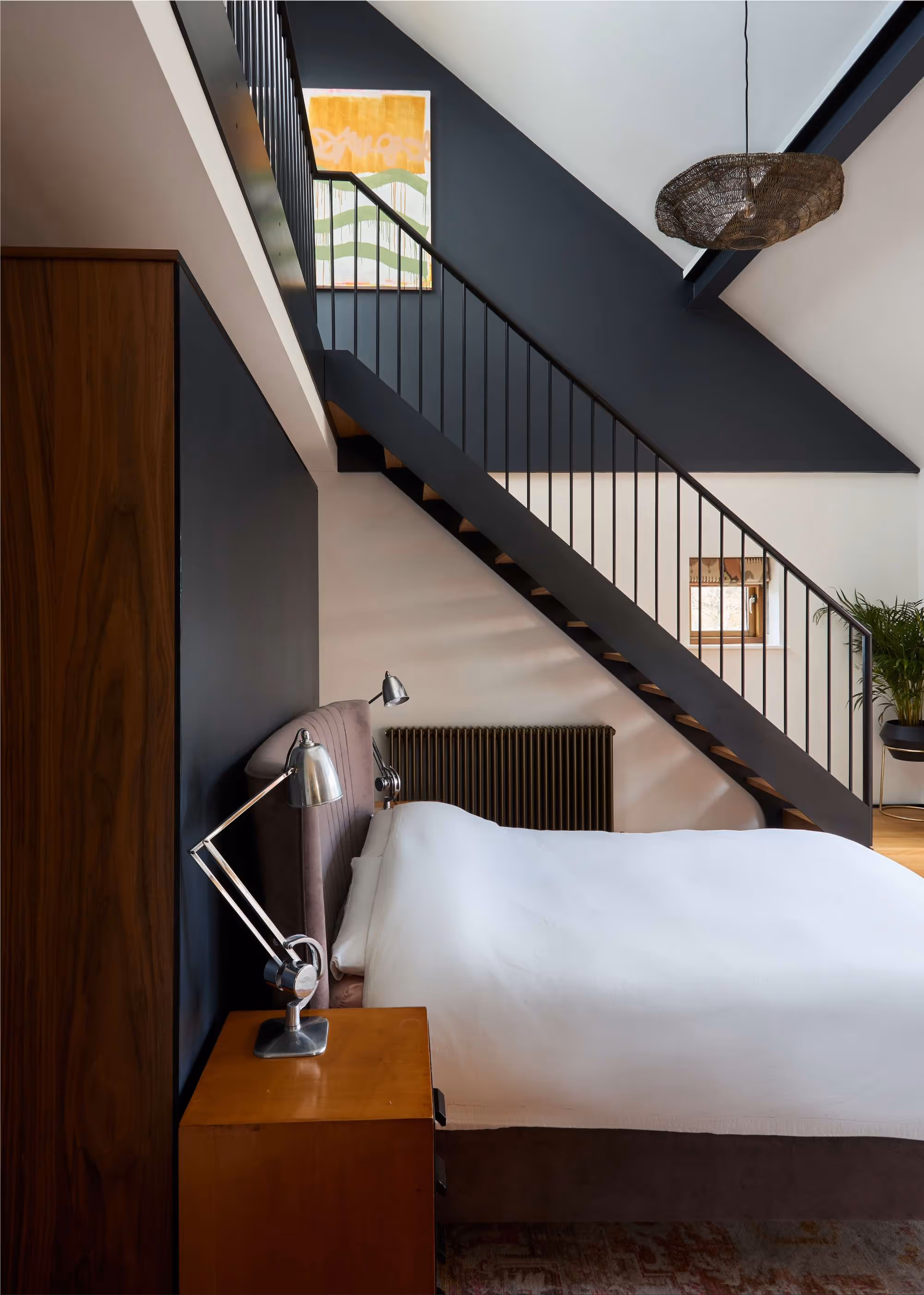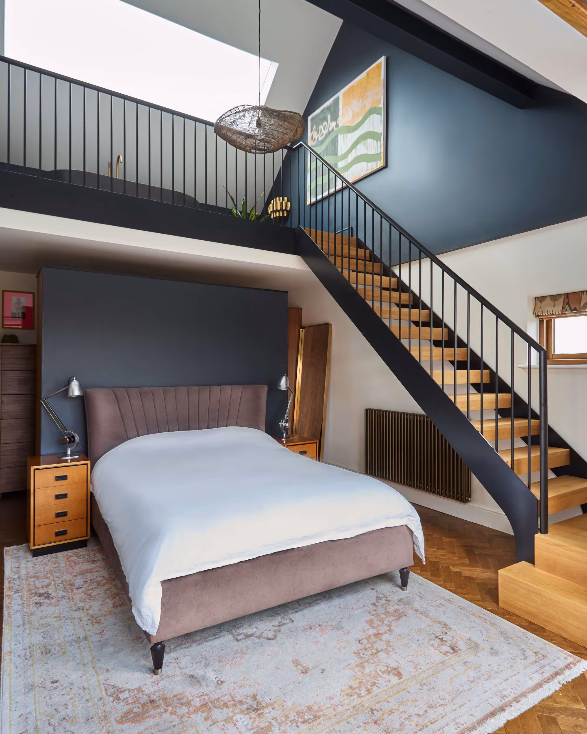 Set within the Welsh countryside, this contemporary master suite features a mezzanine bathroom that overlooks the space below. A window partway down the staircase floods the room with natural light, drawing attention to the architecture and the gentle flow between levels, while keeping the space closely connected to its surroundings. This version of our Carbon staircase leads up to the luxurious bath at the top, forming a strong yet understated presence within the room. Steel balustrades and a matching handrail give it a crisp, modern edge, while the oak treads bring warmth and texture underfoot. Designed to sit naturally within the character of the space, the staircase works as both a practical route and a considered architectural feature that quietly lifts the entire room.
