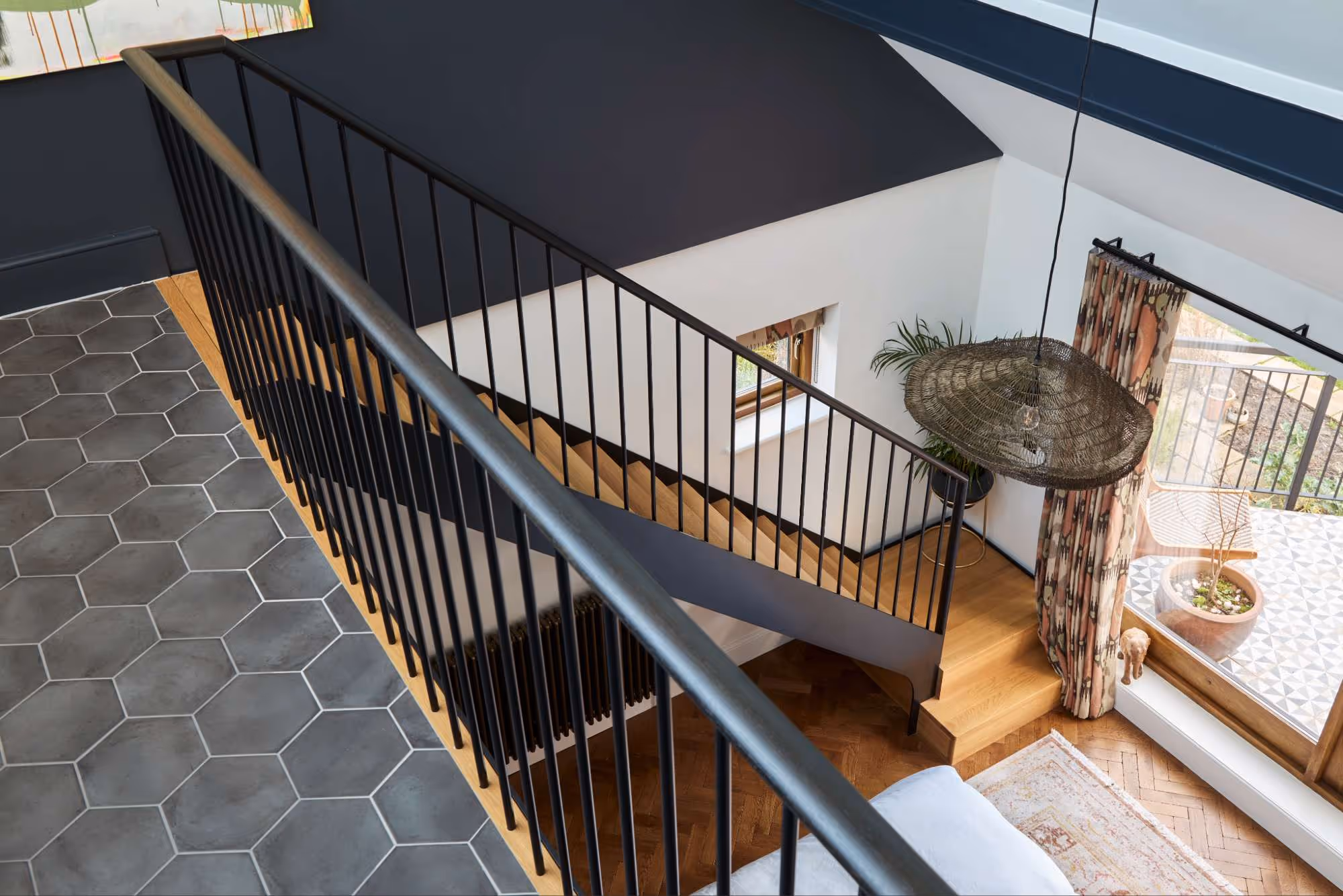 The project involved carefully designing around a plasterboard wall lip, an open en-suite, and a mid-level window, while keeping clean alignment with the outer build-out and maximising natural light to highlight the staircase, in particular the spindles.