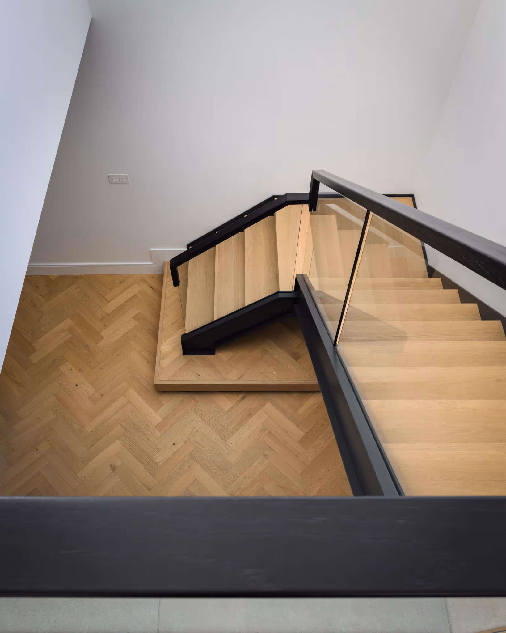 We used embedded glass and fabricated flanges at the top and bottom of the stringers to conceal all fixings. Our head draftsman created a clever connection detail so the stringers wrap around each other seamlessly, resulting in a clean, minimalist design with hidden connections.